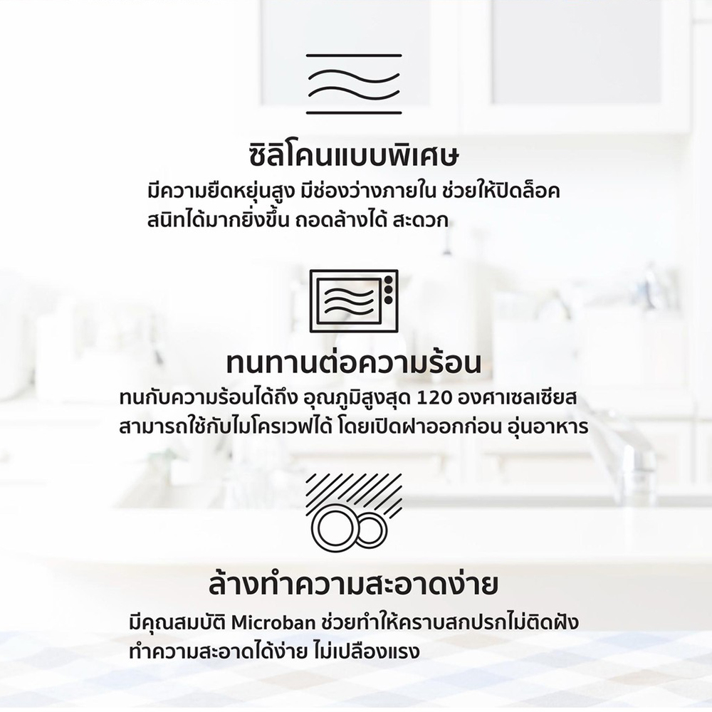 • ทนทานแม้อยู่ในอุณหภูมิร้อนและเย็น สูงสุด -20 และ 120 องศาเซลเซียส ใส่ได้ทั้งช่องแช่แข็งและไมโครเวฟ (ก่อนนำภาชนะเข้าไมโครเวฟ ต้องปลดล็อกทั้ง 4 ด้านออกเพื่อระบายแรงดันอากาศ)